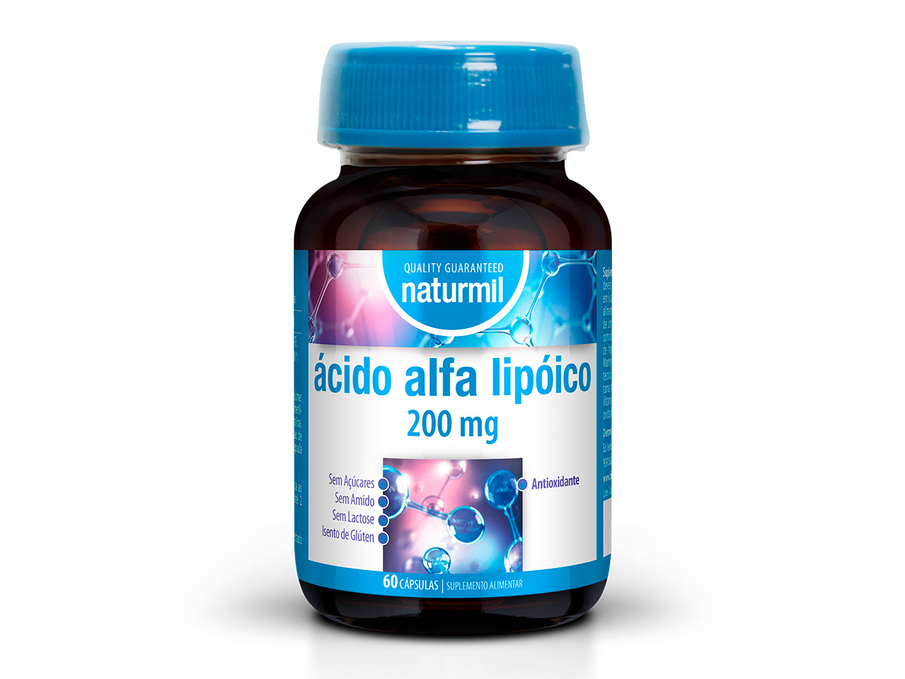 Acido alfa Lipoico 200mg 60 caps da marca Naturmil. Contém 1 cápsula: ácido alfa lipóico 200 mg, vitamina e 12 mg α-te (100% vrn*) * valor de referência do nutriente. 60 cápsulas.