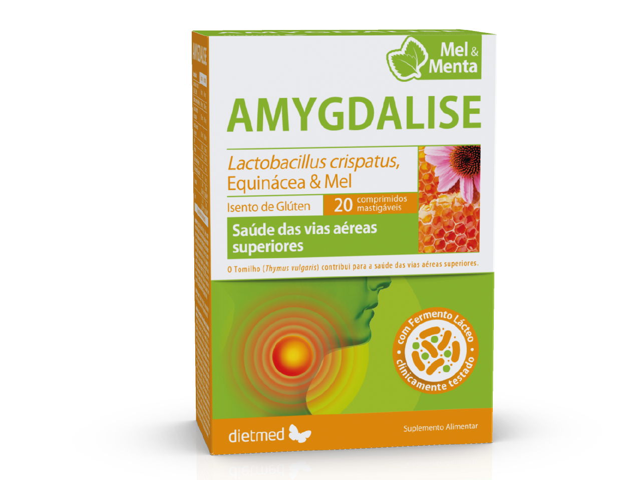 Amygdalise Mel e Limão 20 cmp da marca Naturmil. Contém 1 comprimido: lactobacillus crispatus (dsmz 25988) 10 mg, extrato concentrado de alteia 400 mg, extrato concentrado de equinácea 150 mg, extrato concentrado. 20 comprimidos mastigáveis.