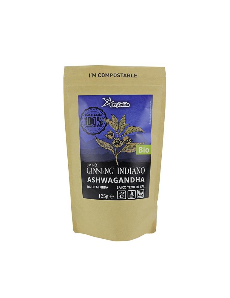 Raiz de Ashwagandha (Withania Somnifera) em pó de produção biológica. PT-BIO-04 Origem: não UE. Embalagem 100% compostável.