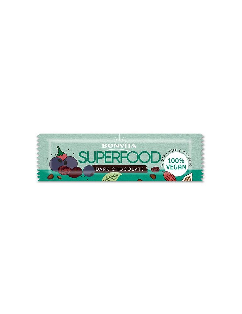 Barra de Chocolate Negro com Superalimentos "Superbar" Bonvita BIO. Sem glúten. Vegan. Sem lactose. Ingredientes: Tâmaras*(44%), farinha de AMÊNDOA*(16%), sultanas*(12%), geleia de tâmara*, chocolate negro*(9%) (pasta de cacau*, açúcar de coco*, manteiga de cacau*), proteína de arroz* (5%), bagas goji*(3%), spirulina em pó*(1%), mirtilo*(1%), concentrado de beterraba*, sementes de chia*(1%), açaí em pó(1%). *de produção biológica. Pode conter vestígios de leite, amendoim e frutos de casca rija.Origem: UE/nã