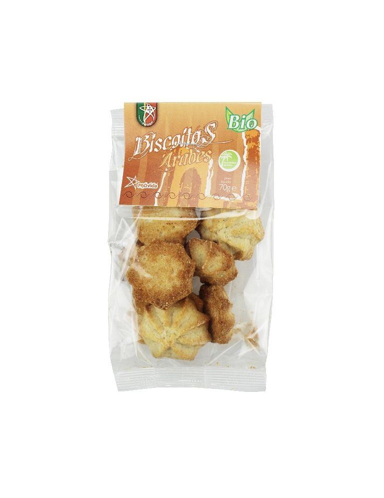 Biscoitos Árabes BIO 70g. Ingredientes: Farinha de TRIGO* (branca e integral), gordura vegetal de palma*, açúcar mascavado*, água, sal marinho, essência de limão*. *de produção biológica. PT-BIO-04 Origem: UE/ Não UE. Contém glúten. Poderá conter vestígios de amendoim, soja, tremoço, sementes de sésamo e frutos de casca rija. Os biscoitos Próvida são cuidadosamente elaborados com ingredientes provinientes de agricultura biológica. São leves e de sabor muito agradável. Não contém ingredientes de origem anima