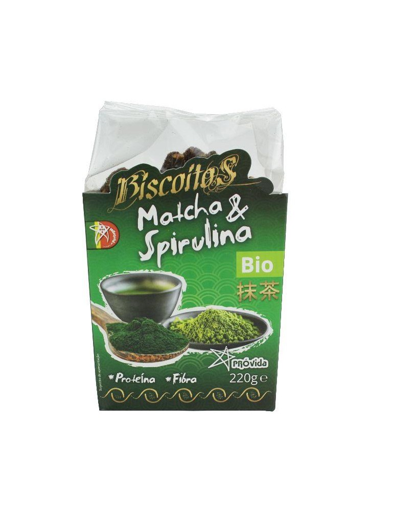 Biscoitos de Matcha e Spirulina BIO 220g. Ingredientes: Farinha* (AVEIA*, arroz*), bebida de AVEIA* (água, AVEIA* (16%), óleo de girassol* prensado a frio, sal marinho), açúcar de coco*, AMENDOIM* sem pele, manteiga de AMENDOIM*, óleo de coco*, farinha de araruta*, spirulina* (1%), matcha-chá verde* (0,4%), estabilizador: goma guar, essência de limão*, fibra* alimentar – inulina. *de produção biológica. PT-BIO-04. Origem UE/não UE. Contém glúten. Poderá conter vestígios de sésamo, frutos de cascas rija, tre