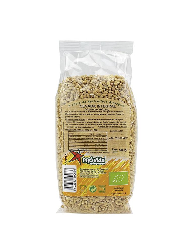Cevada integral de produção biológica. Contém glúten. PT-BIO-04 Origem: UE. Foi à cerca de 7000 anos, o primeiro dos cereais a ser cultivado e foi durante milénios o alimento base dos povos da Bacia Mediterrânica. É um cereal bastante nutritivo e de fácil digestão.