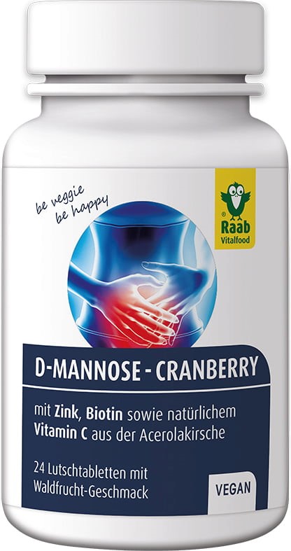 - Cada pastilha para chupar com D- manose e arandos vermelhos da Raab contém 2 g de D-manose, 1,8 mg de proantocianidinas (PAC) de arando vermelho, zinco, biotina e vitamina C natural de acerola.