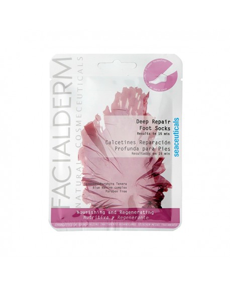 Blue Marine Complex nsivo para Pés. Meias de cuidados Intensivo para Pés. Fórmula de ação reparadora intensiva com sérum de Porphyra tenera algae (Hidratação e Nutrição) e Blue Marine Complex (Hidratação e Vitalidade). Ideal para pés secos. Amacia calos e contribui com um efeito hidratante extra nas zonas mais secas. Melhora a regeneração da pele internamente. A alga Porphyra Tenera tem uma pro
