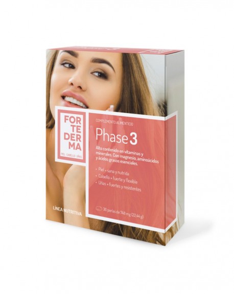 Produzido à base de ácidos gordos essenciais (Ómega-3 e Ómega-6), vitaminas, aminoácidos e minerais Phase 3 é um suplemento que oferece uma tripla acção protectora, fortalecedora e, por sua vez, com um efeito estimulante e antioxidante para para recuperar a vitalidade do Cabelo e das Unhas. - Graças à inovação da Nutricosmética este suplemento actua a partir do interior, melhorando o aspecto exterior da Pele, Cabelo e Unhas .