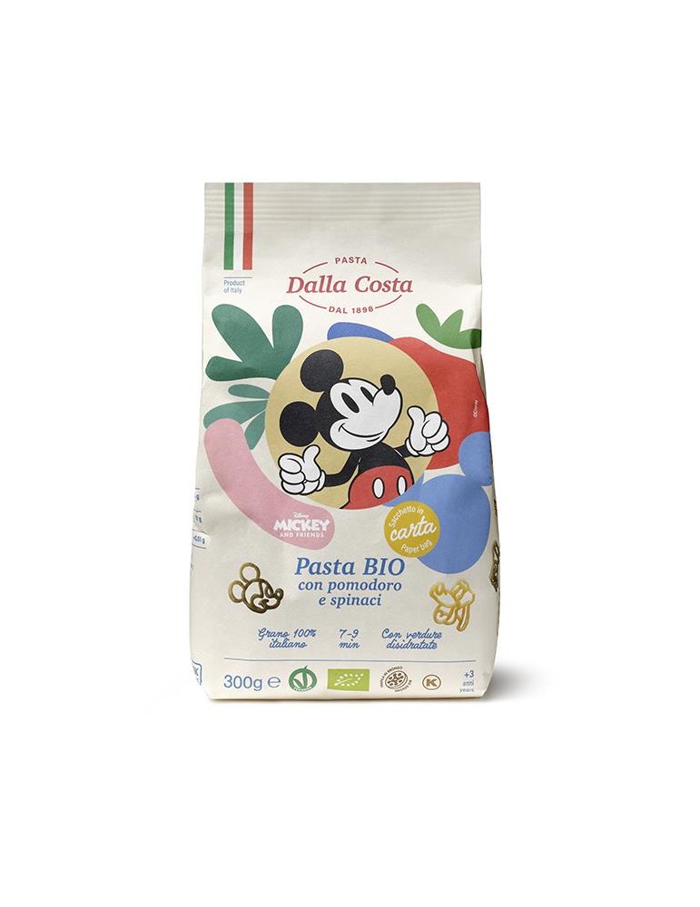 Massa Tricolor Disney Mickey BIO 300g. Massa de sêmola de trigo duro com tomate e espinafre BIO Mickey Dalla Costa 300g.