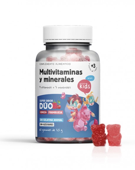 Vitamina A 240 μg (30% VRN), vitamina D 1,5 μg-60 UI (30% VRN), vitamina E 3,6 mg (30% VRN), vitamina C 24 mg (30% VRN), vitamina B6 0,42 mg ( 30% VRN), ácido fólico 60 μg (30% VRN), vitamina B12 0,75 μg (30% VRN), biotina 15 μg (30% VRN), ácido pantotênico 1,8 mg (30% VRN), zinco 3 mg (30% VRN), iodo 45 μg (30% VRN) e selênio 16,5 μg (30% VRN). VRN Valores de Referência de Nutrientes. IU: Unidades Internacionais. Outros ingredientes: maltitol (adoçante), sorbitol (edulcorante), pectina (agente Outros ingredientes: maltitol (adoçante), sorbitol (edulcorante), pectina (agente gelificante), água, ácido cítrico (acidificante), aromas de framboesa e cereja e corantes carmim. Não contém: Glúten e lactose. Advertências: Este produto não tem contraindicações. Não use este produto se for sensível ou alérgico a qualquer um dos componentes que ele contém. Por esse motivo, é aconselhável ler bem todos os ingredientes da composição. Pessoas medicadas, mulheres grávidas ou lactantes devem consultar seu médico ou especialista sobre o uso deste produto. Multivitaminas y Minerales KIDS Multivitaminas y Minerales KIDS 30