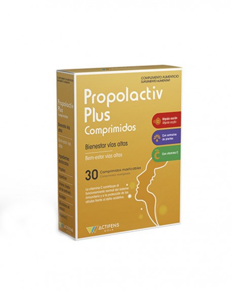 Extrato de Própolis (85 mg)(padronizado para 8-12% de galangina) (8,5 mg de galangina), Extrato de Equinácea ( Echinacea angustifolia ) (85 mg) (padronizado para 4% de polifenóis), Extrato de Erva dos Cantores ( Sisymbrium officinalis ) (72 mg), Extrato de Eucalipto ( Eucalyptus globulus ) (160 mg) e vitamina C (ácido ascórbico) 80 mg (100% V.R.N.). V.R.N.- Valor de Referência do Nutriente. Outros ingredientes: Isomalte, xilitol, estévia ( Stevia rebaudiana ) e estearato de magnésio vegetal. Não Outros ingredientes: Isomalte, xilitol, estévia ( Stevia rebaudiana ) e estearato de magnésio vegetal. Não contém: Glúten. Advertências: Não usar em caso de doenças autoimunes (devido a Equinácea). Pessoas sensíveis ou alérgicas a qualquer componente, não devem usar este produto. Por esse motivo, é aconselhável ler bem todos os ingredientes da composição. Pessoas medicadas, mulheres grávidas ou amamentando devem consultar seu médico ou especialista sobre o uso de Suplementos Alimentares. Propolactiv Plus Comprimidos Propolactiv Plus Comprimidos 30