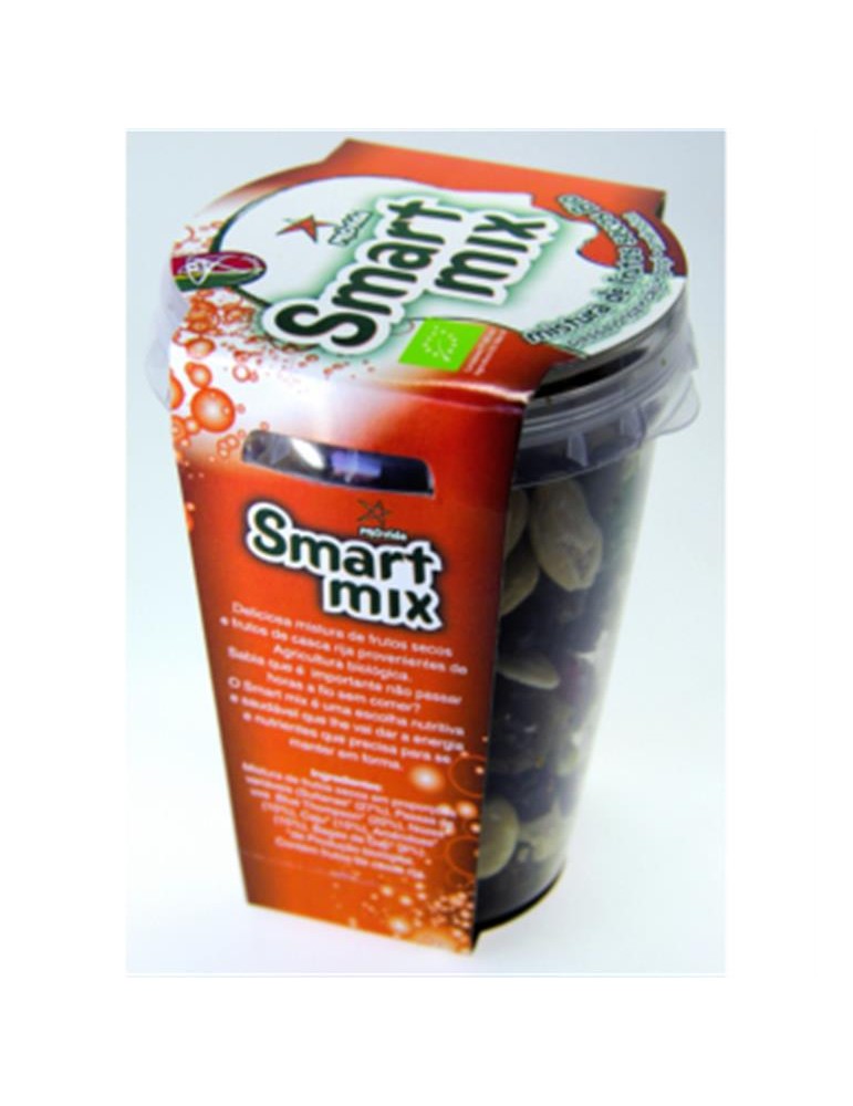 Deliciosa mistura de frutos secos e frutos de casca rija provenientes de Agricultura biológica. Sabia que é importante não passar horas a fio sem comer? O Smart Mix é uma escolha nutritiva e saudável que lhe vai dar a energia e nutrientes que precisa para se manter em forma. Ingredientes: Mistura de frutos secos em proporções variáveis (Sultanas* (27%), Passas de uva Blue Thompson* (20%), Nozes* (15%), Caju* (15%), Amêndoas* (15%), Bagas de Goji* (8%). *de Produção biológica. Contém frutos de casca rij