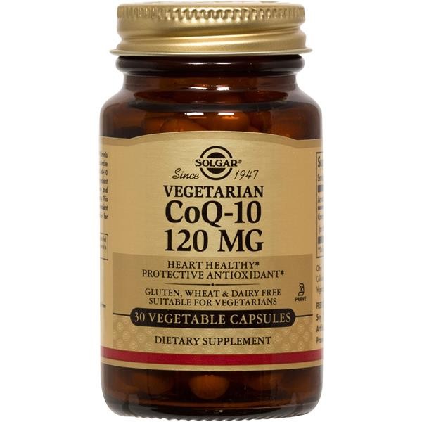 Fornece coenzima Q-10 (Ubiquinona) Solgar CoQ-10 é um suplemento alimentar que fornece 120 mg de coenzima Q-10 por cápsula. SENTO DE: açúcar, sal, amido, glúten, trigo, produtos lácteos, soja, levedura, conservantes, edulcorantes, aromatizantes artificiais ou corantes. Adequado a vegans. Suplemento Alimentar – COENZIMA Q-10 120 mg