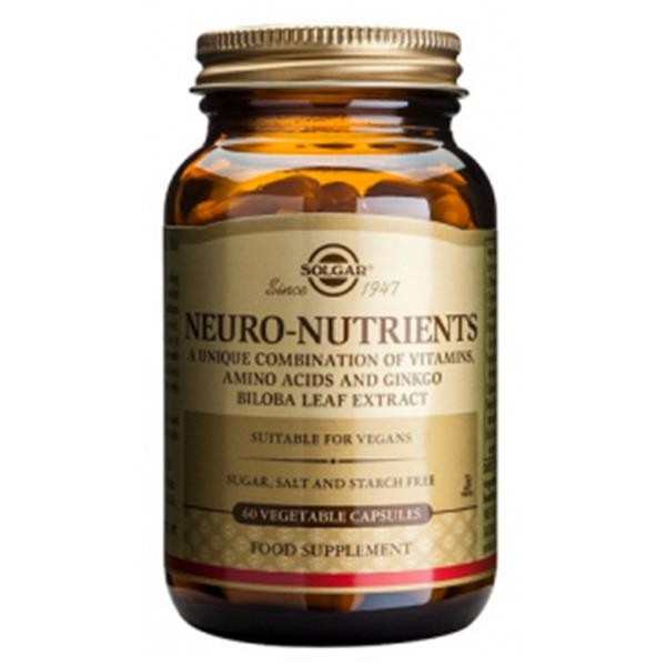 Suplemento alimentar que fornece vitaminas, aminoácidos e extrato de ginkgo biloba. Solgar Neuronutrientes fornece um conjunto de vitaminas e aminoácidos importantes no funcionamento adequado do cérebro, e extrato de ginkgo biloba. É isento de açúcar, sal, amido, levedura, trigo, glúten e produtos lácteos. Formulado sem o uso de conservantes, aromatizantes nem corantes artificiais. Adequado a vegans.