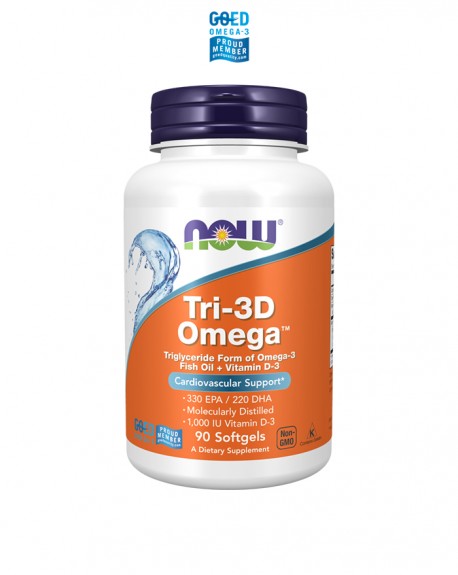 NOW ® TRI-3D Omega ™ é uma fórmula de óleo de peixe concentrado, com elevado grau de pureza devido a uma destilação molecular, e que oferece 330 mg de EPA e 220 mg de DHA por dose diária. - Estes ácidos de Ómega 3 contribuem para a manutenção da saúde cardiovascular e nervosa sendo envolvidos em diferentes pesquisas científicas no âmbito das dislipidemias, doenças neurodegenerativas, etc.