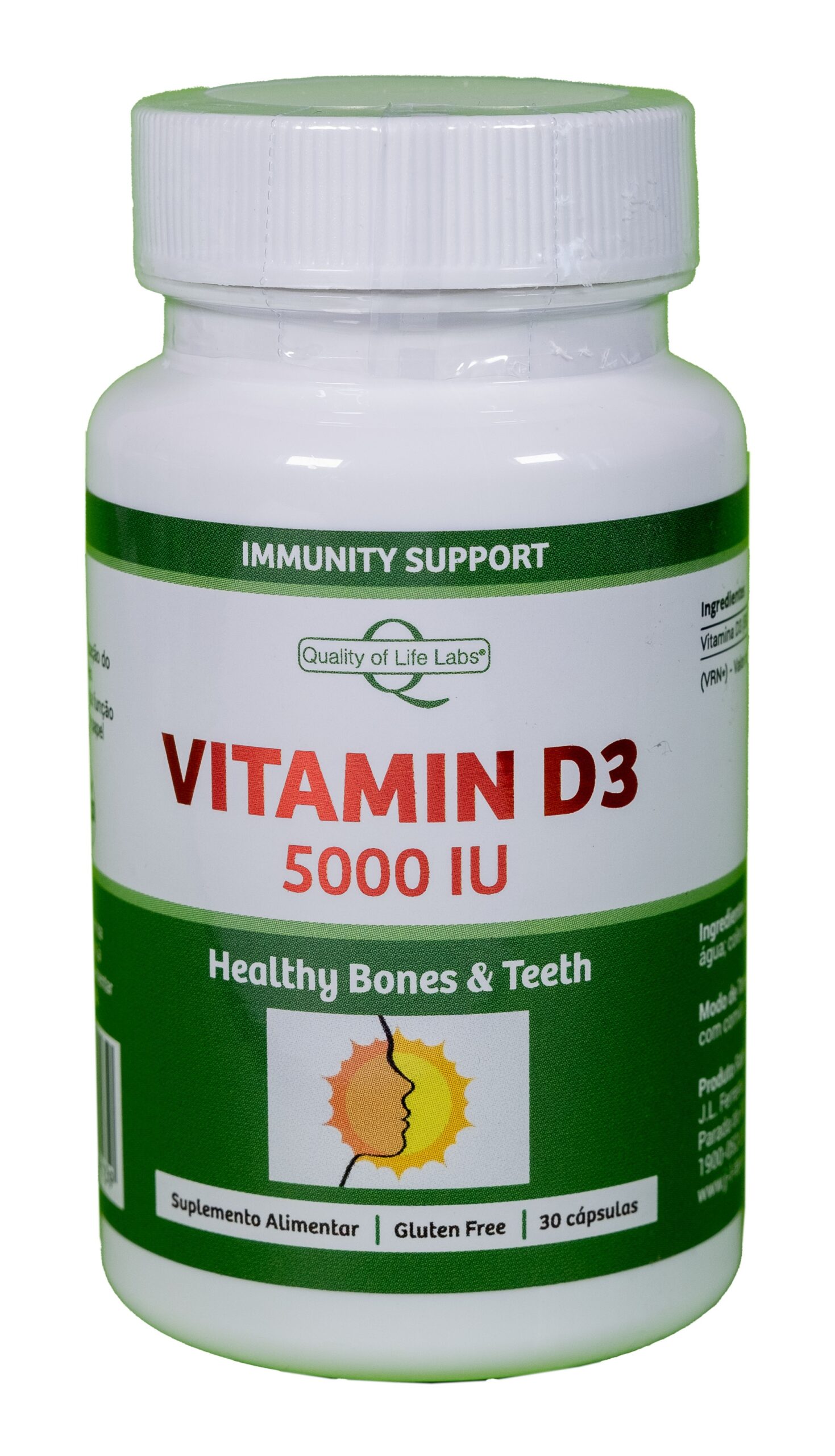 Por sofgel (cápsula mole) : Vitamina D3 (colecalciferol) – 5000 UI /125µg (2500% da DDR). Outros ingredientes: óleo de oliva ; softgel: gelatina, glic erina e águ a. Isento de glúten, trigo e derivados lácteos.