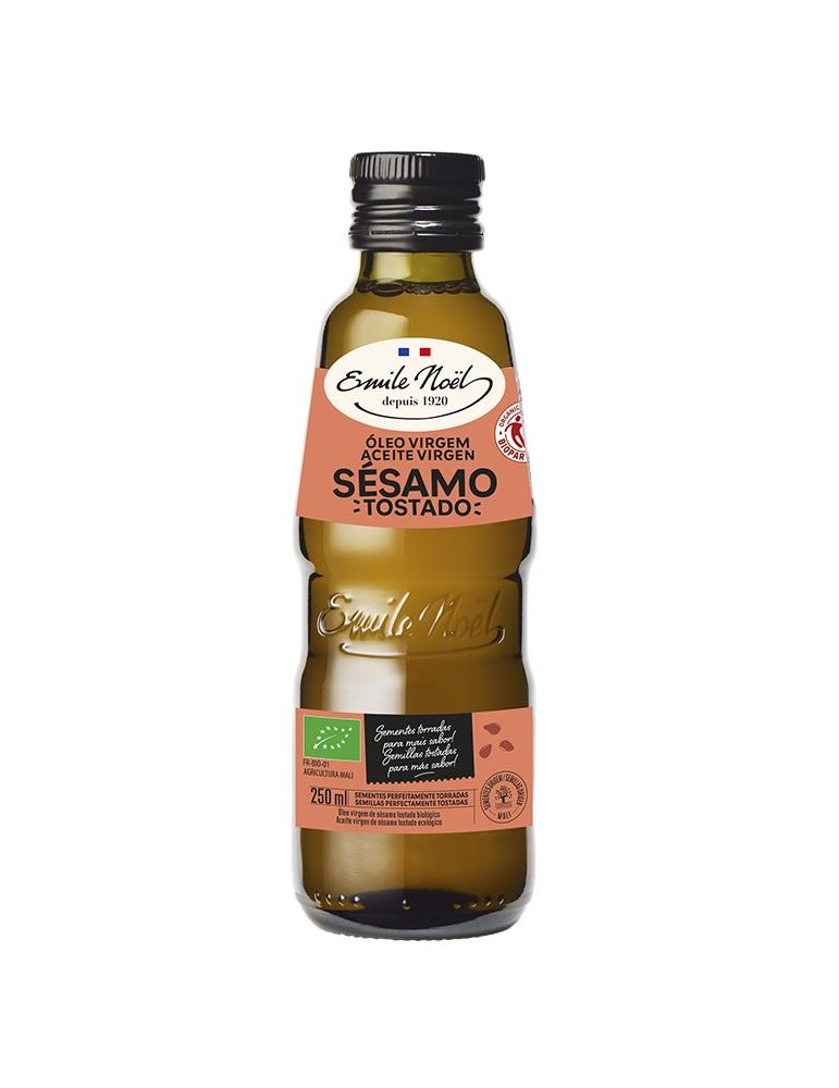 Óleo de Sésamo Virgem Tostado BIO E.Noel 250ml é um óleo de alta qualidade, extraído de sementes de sésamo orgânico que são levemente tostadas, o que lhe confere um sabor único, intenso e um toque de nozes. Esse processo de torrefação realça o aroma e a textura do óleo, tornando-o perfeito para temperar pratos, especialmente aqueles de origem asiática, como saladas, molhos, arroz frito e pratos com tofu.