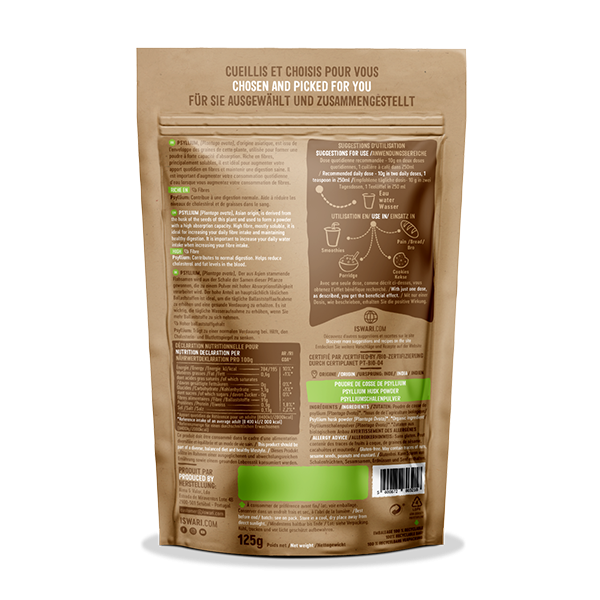 O Psyllium Husk em Pó Bio da Iswari é uma fonte excecional de fibra solúvel natural, obtida a partir da casca (husk) das sementes de Psílio (Plantago ovata), uma planta de origem asiática com propriedades benéficas comprovadas para a saúde intestinal e cardiovascular.