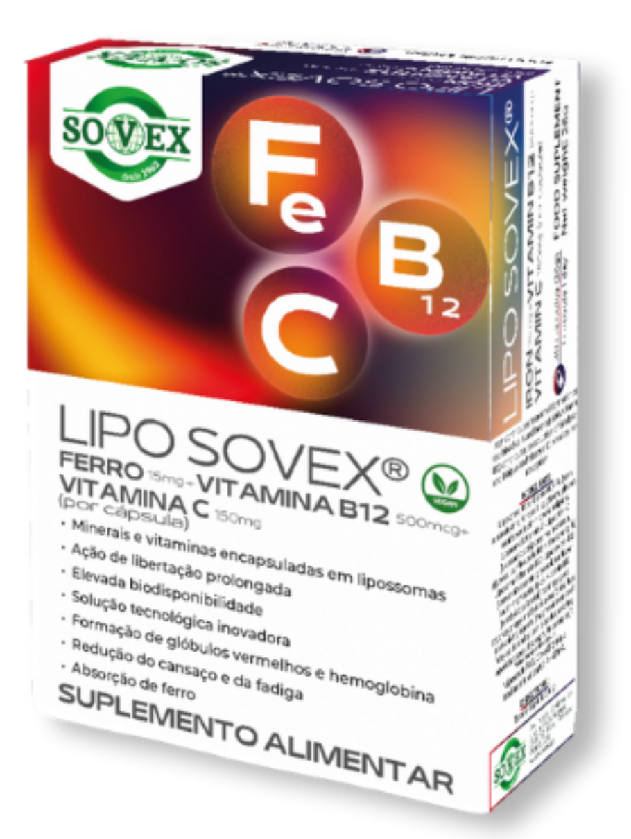 LIPO SOVEX® é um suplemento alimentar lipossomal com ferro, vitamina B12 e vitamina C, de alta absorção e biodisponibilidade, que ajuda na formação de glóbulos vermelhos, hemoglobina e reduz o cansaço e a fadiga.