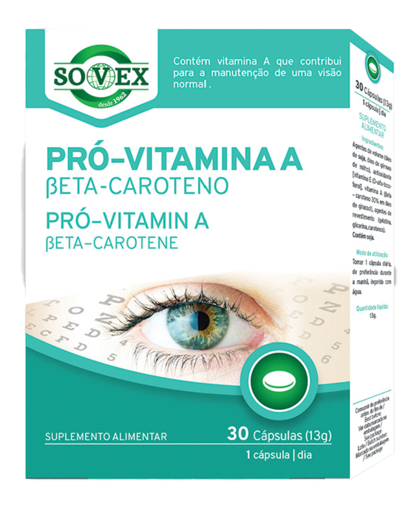 Suplemento alimentar com βeta-caroteno (pré-vitamina A) por cápsula. Contribui para a saúde da visão, pele e sistema imunitário. Isento de glúten, lactose e produtos lácteos.